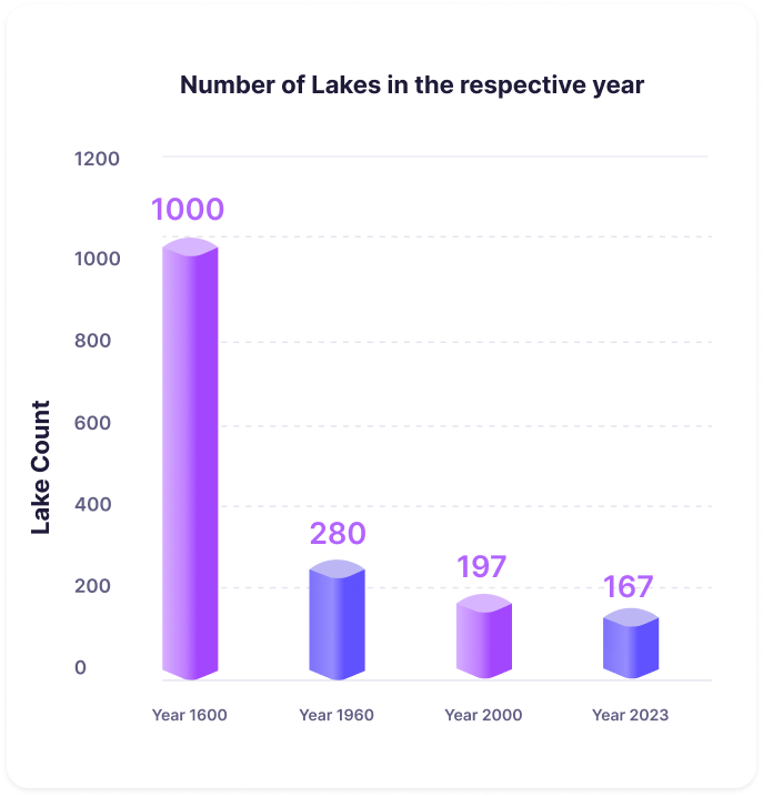 - Lakes have been drastically reduced , primarily due to factors such as urbanization, encroachment, and pollution.